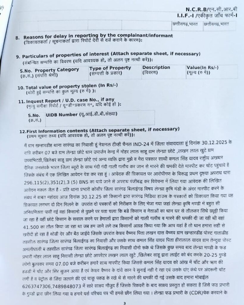 लेन्ध्रा छोटे धान उपार्जन केंद्र में अनियमितताओं की पड़ताल करने पहुंचे पत्रकारों पर हमला करने का गंभीर मामला सामने आया है। नेशनल टीवी चैनल IND-24 के जिला संवाददाता केशव वैष्णव और राष्ट्रीय अखबार दैनिक जनसंपर्क भारत के जिला ब्यूरो कमल सिंह यादव के साथ गाली-गलौच, मारपीट और जान से मारने की धमकी दी गई। घटना 30 दिसंबर 2025 की शाम करीब 7 बजे की बताई जा रही है।