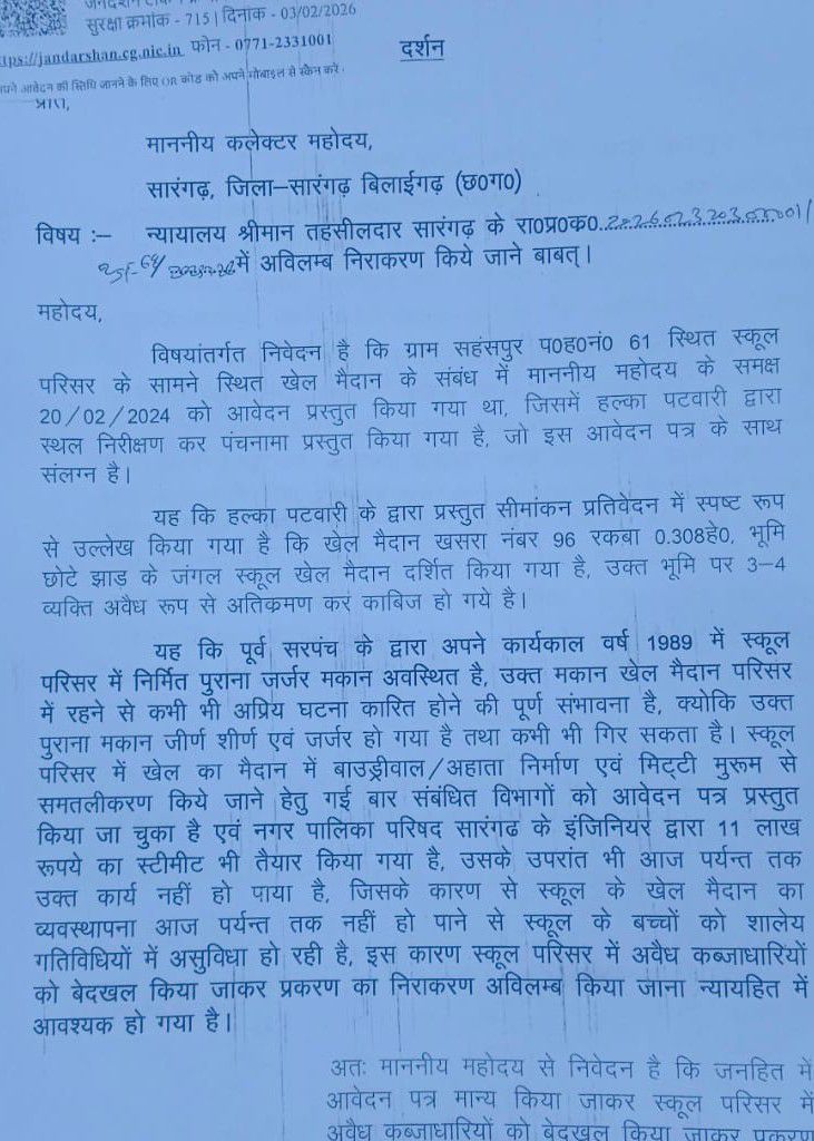 सारंगढ़। जनदर्शन टोकन क्रमांक 2310126000352 के तहत एक महत्वपूर्ण आवेदन प्रस्तुत कर ग्राम सहसपुर (प०ह०नं० 61) स्थित शासकीय स्कूल परिसर के सामने स्थित खेल मैदान को अतिक्रमणमुक्त कराने और लंबित प्रकरण के शीघ्र निराकरण की मांग की गई है। आवेदन माननीय कलेक्टर, सारंगढ़, जिला सारंगढ़ बिलाईगढ़ (छ.ग.) के समक्ष प्रस्तुत किया गया।