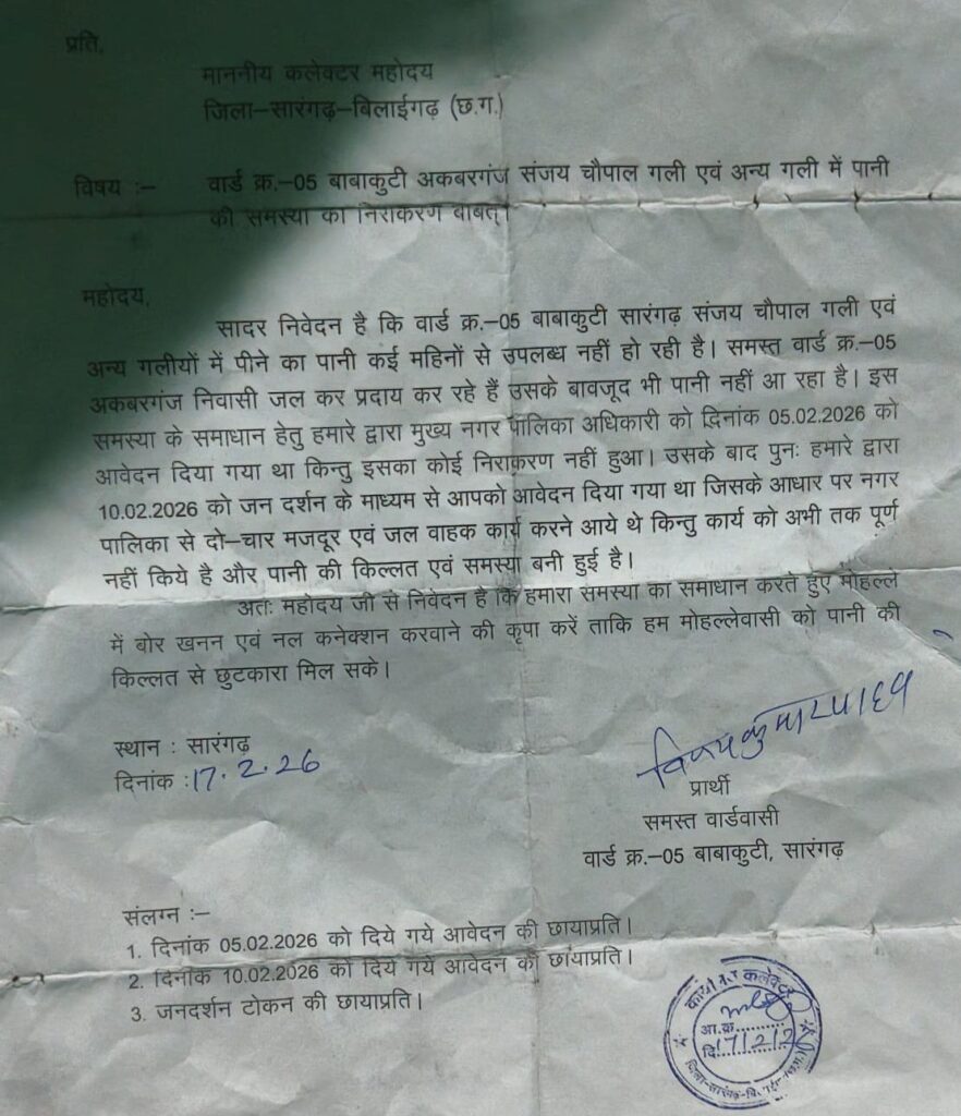 मोहल्लेवासियों ने बताया कि 05 फरवरी 2026 को मुख्य नगर पालिका अधिकारी को आवेदन दिया गया था। इसके बाद 10 फरवरी 2026 को जनदर्शन में कलेक्टर को भी शिकायत की गई। शिकायत के बाद नगर पालिका की ओर से कुछ मजदूर पहुंचे, लेकिन पाइपलाइन की मरम्मत अधूरी छोड़ दी गई और अब तक नियमित जलापूर्ति शुरू नहीं हो सकी।