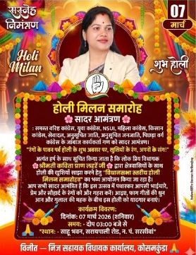 कार्यक्रम में होली के पारंपरिक फाग गीतों, रंग-गुलाल और आपसी मिलन के साथ उत्सव का माहौल बनेगा। विधायक कविता प्राण लहरें क्षेत्रवासियों के साथ होली की खुशियां साझा करेंगी और सभी से आपसी प्रेम, भाईचारे और सौहार्द को बनाए रखने का संदेश देंगी।