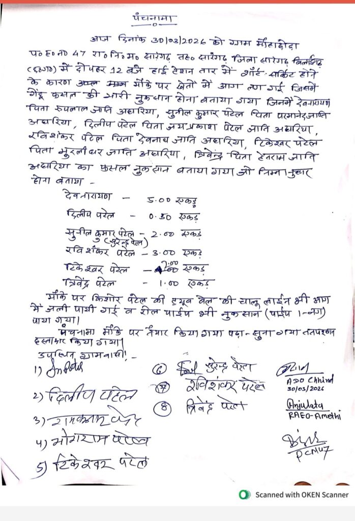प्राप्त जानकारी के अनुसार, इस अग्निकांड में करीब 13 से 14 एकड़ क्षेत्र में खड़ी फसल जलकर पूरी तरह नष्ट हो गई। प्रभावित किसानों में देवनारायण (5 एकड़), रविशंकर पटेल (3 एकड़), सुनील कुमार पटेल (2 एकड़), टिकेश्वर पटेल (2 एकड़), त्रिवेंद्र पटेल (1 एकड़) एवं दिलीप पटेल (0.50 एकड़) शामिल हैं। किसानों को भारी आर्थिक नुकसान उठाना पड़ा है।